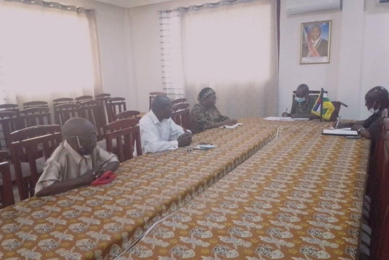 Rencontre d’échange relatif à un partenariat entre le réseau des organisations de la société civile de Centrafrique pour la gouvernance et le développement et l’Université de Bangui. La vice rectrice, le secrétaire général, la présidente et les membres du bureau de rosca.